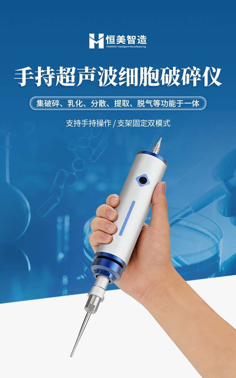 手持超声波细胞破碎仪是一种便携式、高精度的超声波处理设备,适用于实验室小规模样品破碎、乳化、分散和提取等操作。其一体化设计集成了超声波发生器和换能器,操作灵活,可手持使用或搭配支架固定,适用于生物、化学、材料等领域的高效样品处理。
