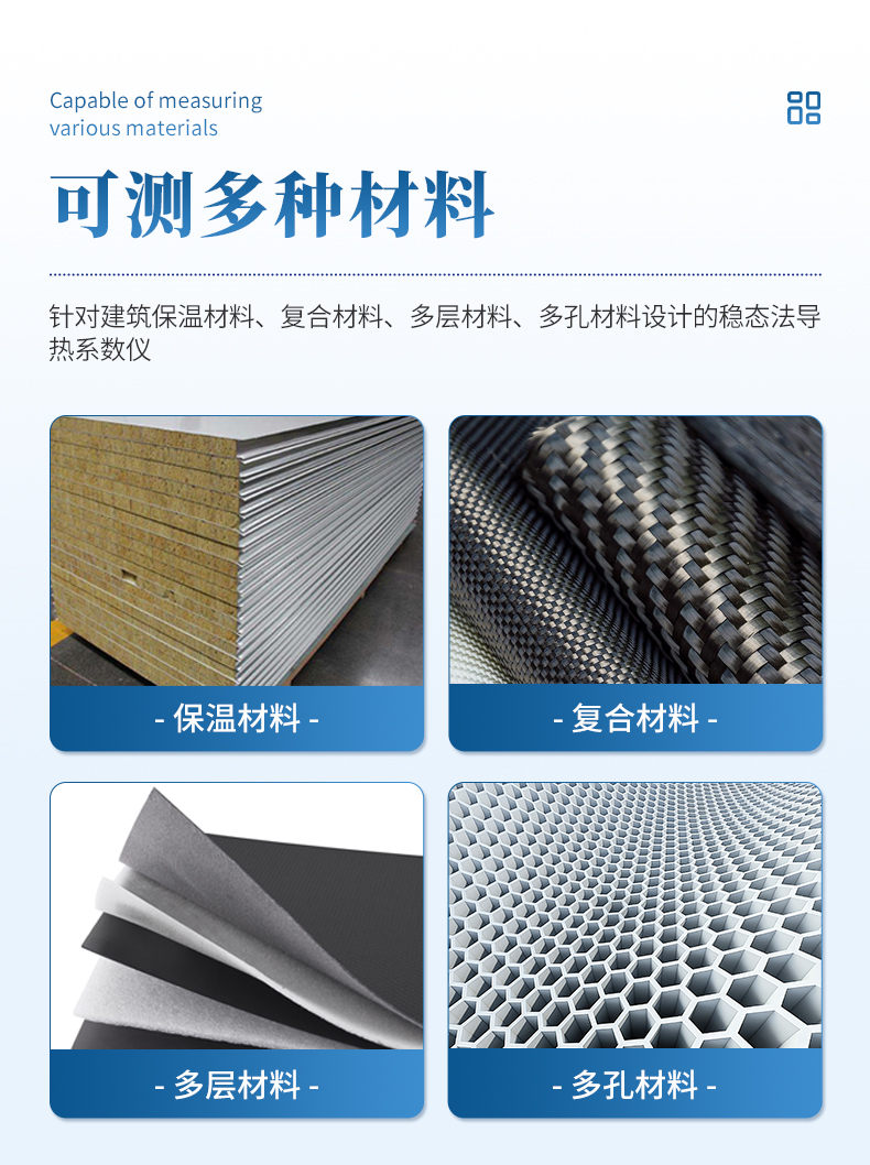 金属、陶瓷、合金、矿石、聚合物、复合材料、纸、织物、泡沫塑料(表面平整的隔热材料、板材)、矿物棉、水泥墙体、玻璃增强复合板CRC、水泥聚苯板、夹心混凝土、玻璃钢面板复合板材、纸蜂窝板、胶体、液体、粉末、颗粒状和膏状固体等等,测试对象广泛。