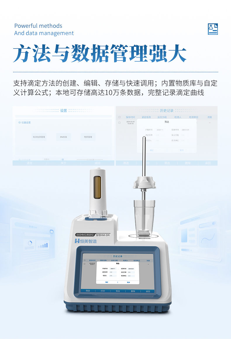 7.★强大的方法与数据管理:支持滴定方法的创建、编辑、存储与快速调用;内置物质库与自定义计算公式;本地可存储高达10万条数据,完整记录滴定曲线。