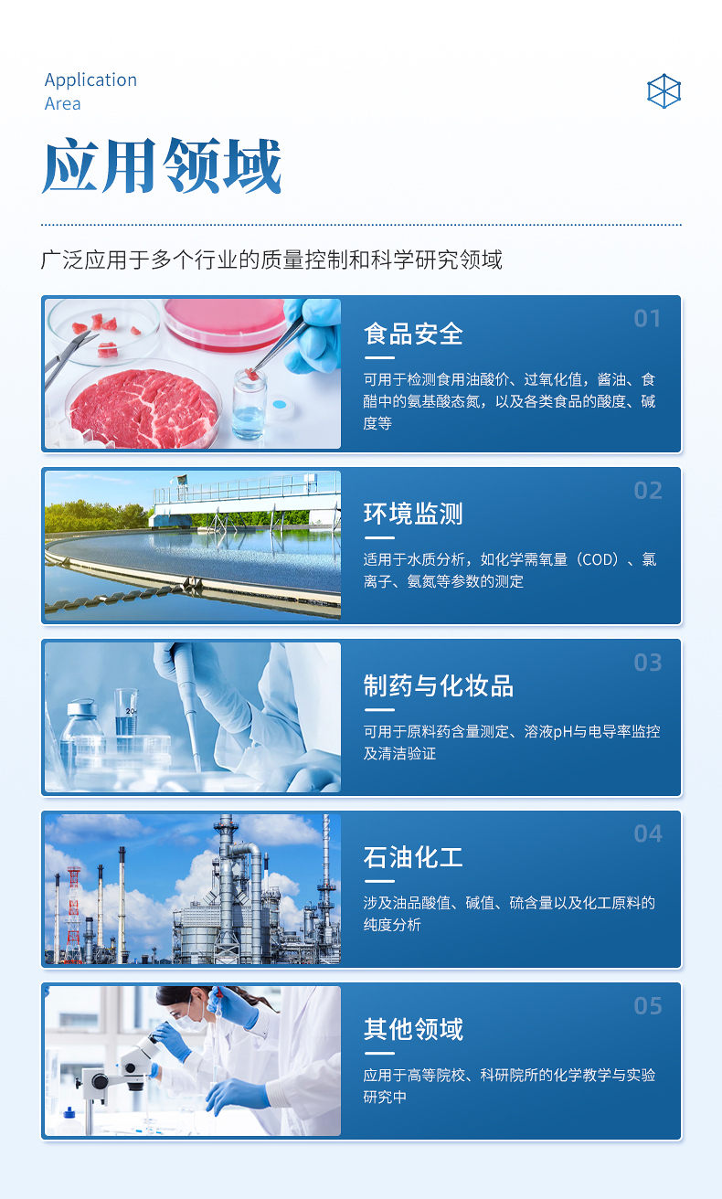 全自动电位滴定仪凭借其全面的滴定模块与高精度测量性能,广泛应用于多个行业的质量控制和科学研究领域。在食品安全领域,它可用于检测食用油酸价、过氧化值,酱油、食醋中的氨基酸态氮,以及各类食品的酸度、碱度等。在环境监测方面,适用于水质分析,如化学需氧量(COD)、氯离子、氨氮等参数的测定。制药与化妆品行业可用于原料药含量测定、溶液pH与电导率监控及清洁验证。石油化工领域则涉及油品酸值、碱值、硫含量以及化工原料的纯度分析。此外,该仪器在高等院校、科研院所的化学教学与实验研究中,同样是一款可靠的分析工具,能够满足从基础滴定到复杂体系研究的多种需求,为用户提供准确、高效且灵活的自动化分析解决方案。