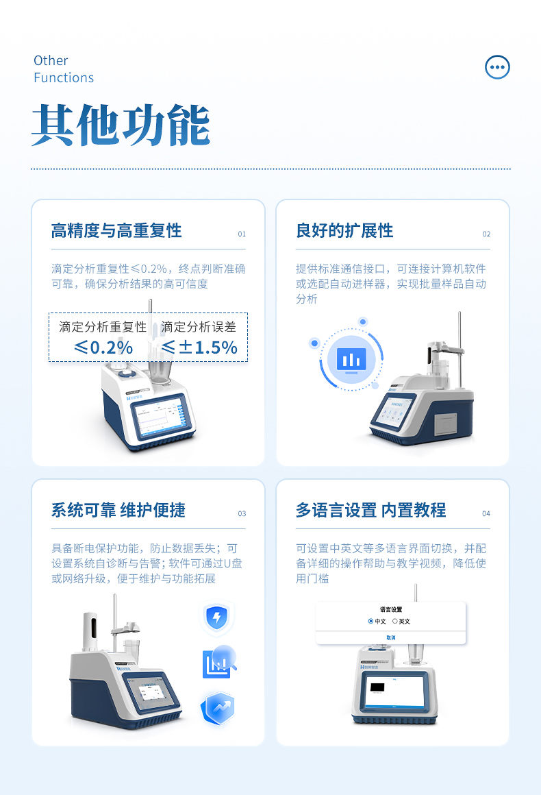 3.高精度与高重复性:滴定分析重复性≤0.2%,终点判断准确可靠,确保分析结果的高可信度。