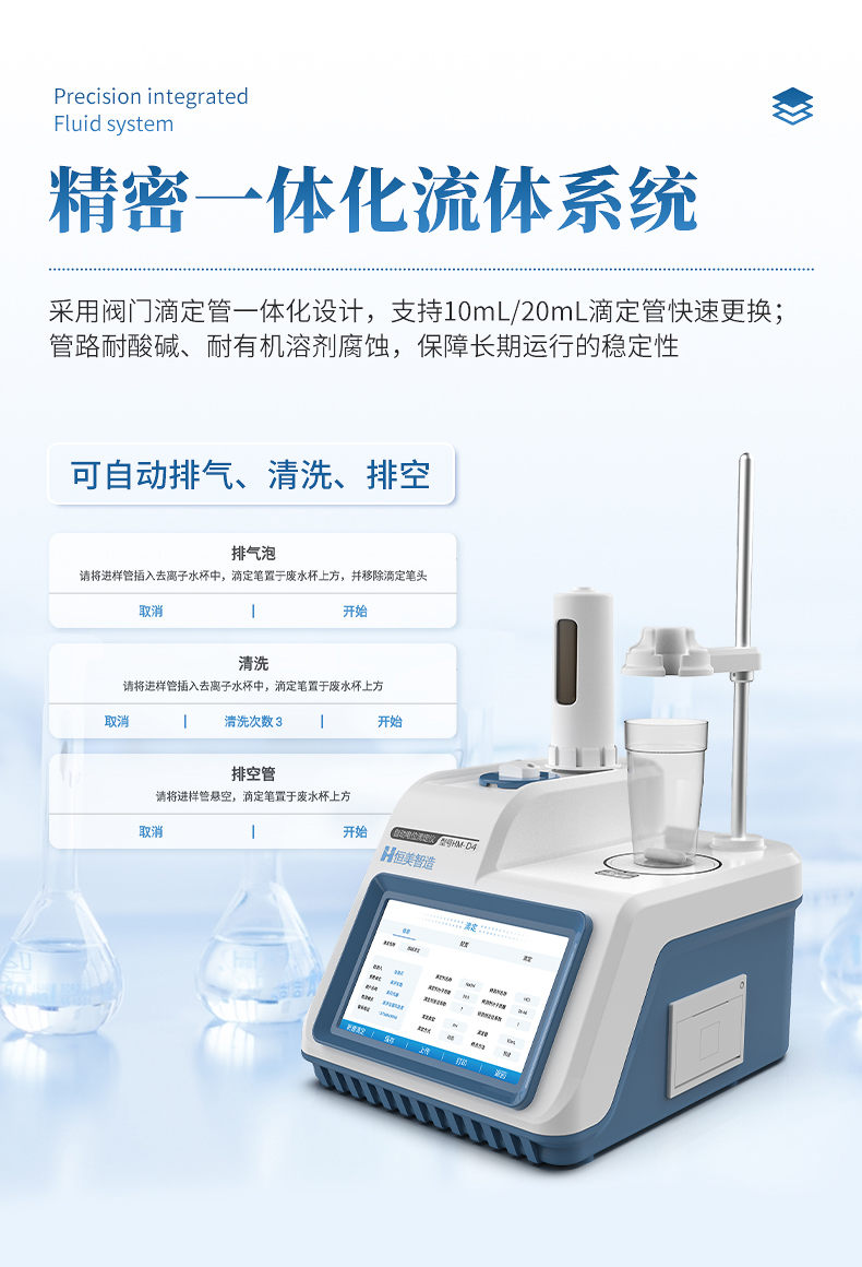 4.精密一体化流体系统:采用阀门滴定管一体化设计,支持10 mL/20 mL滴定管快速更换;管路耐酸碱、耐有机溶剂腐蚀,保障长期运行的稳定性。
