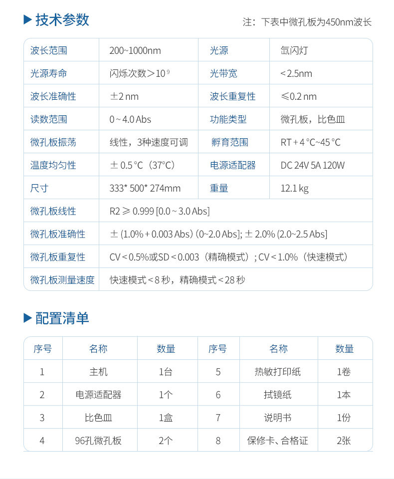 11. 微孔板重复性(450 nm):CV < 0.5%或SD < 0.003(精确模式);CV < 1.0%(快速模式)
