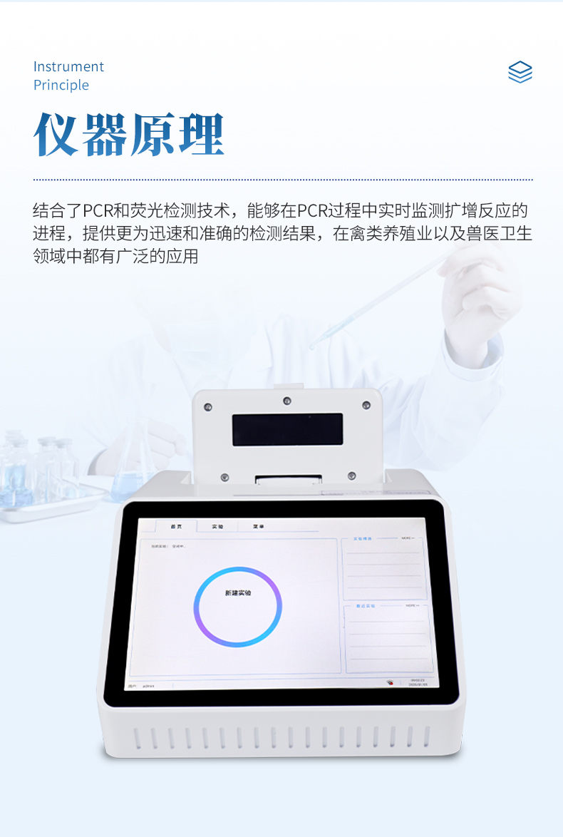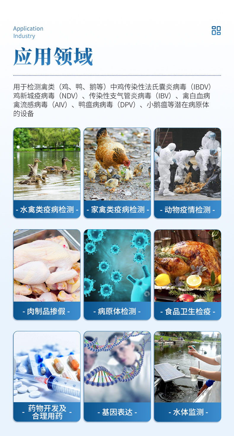 实时荧光PCR检测结合了PCR和荧光检测技术,荧光PCR检测仪能够在PCR过程中实时监测扩增反应的进程,提供更为迅速和准确的检测结果。在禽类养殖业以及兽医卫生领域中都有广泛的应用。
