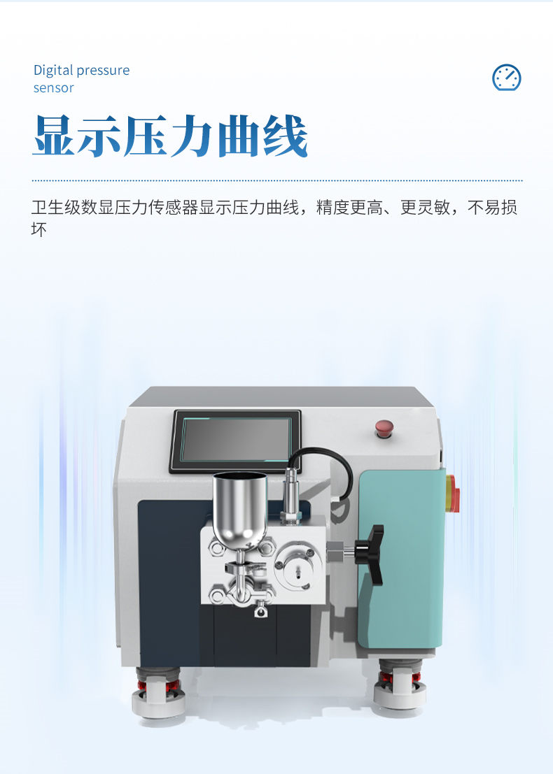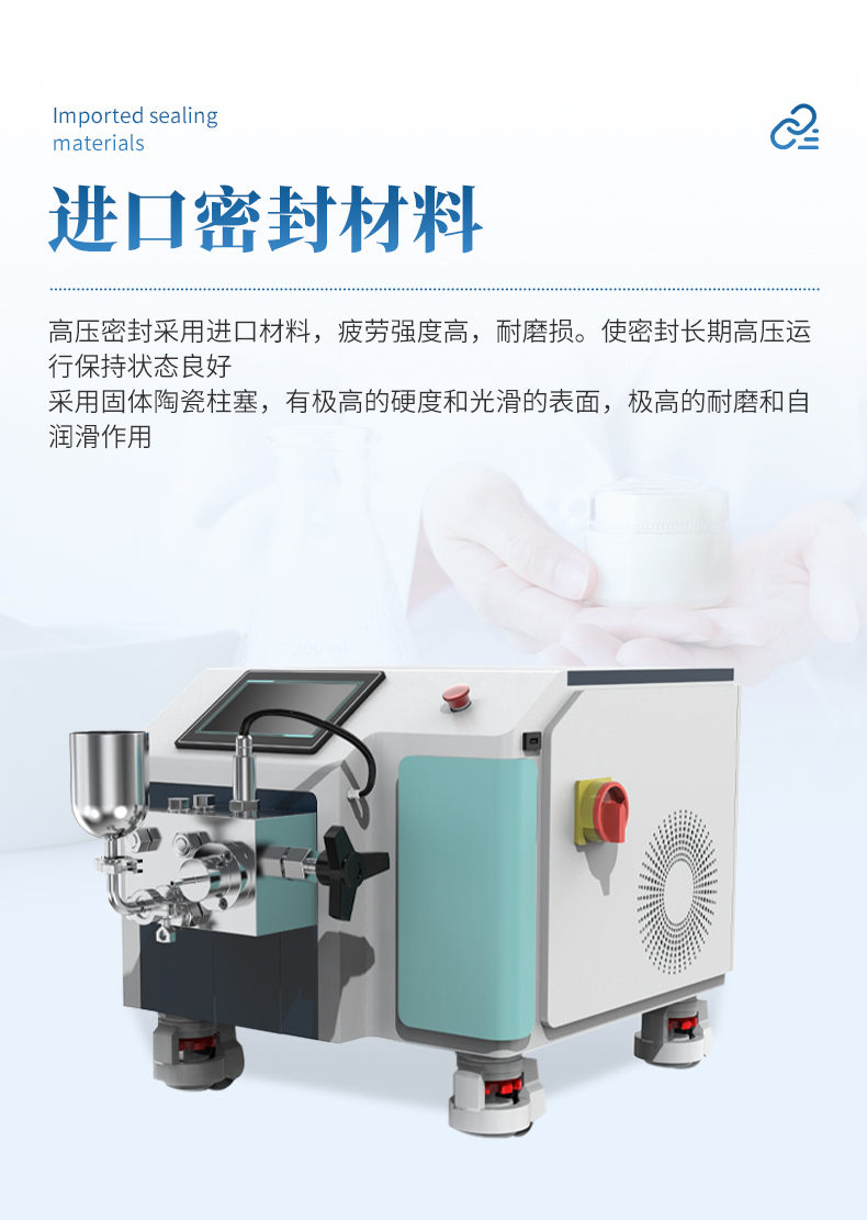 3、卫生级设计:采用氧化锆陶瓷柱塞和金刚石均质阀,以及SUS316L不锈钢导向板,不仅保证了设备的耐用性,也满足了卫生标准,特别适用于制药、化妆品等行业。