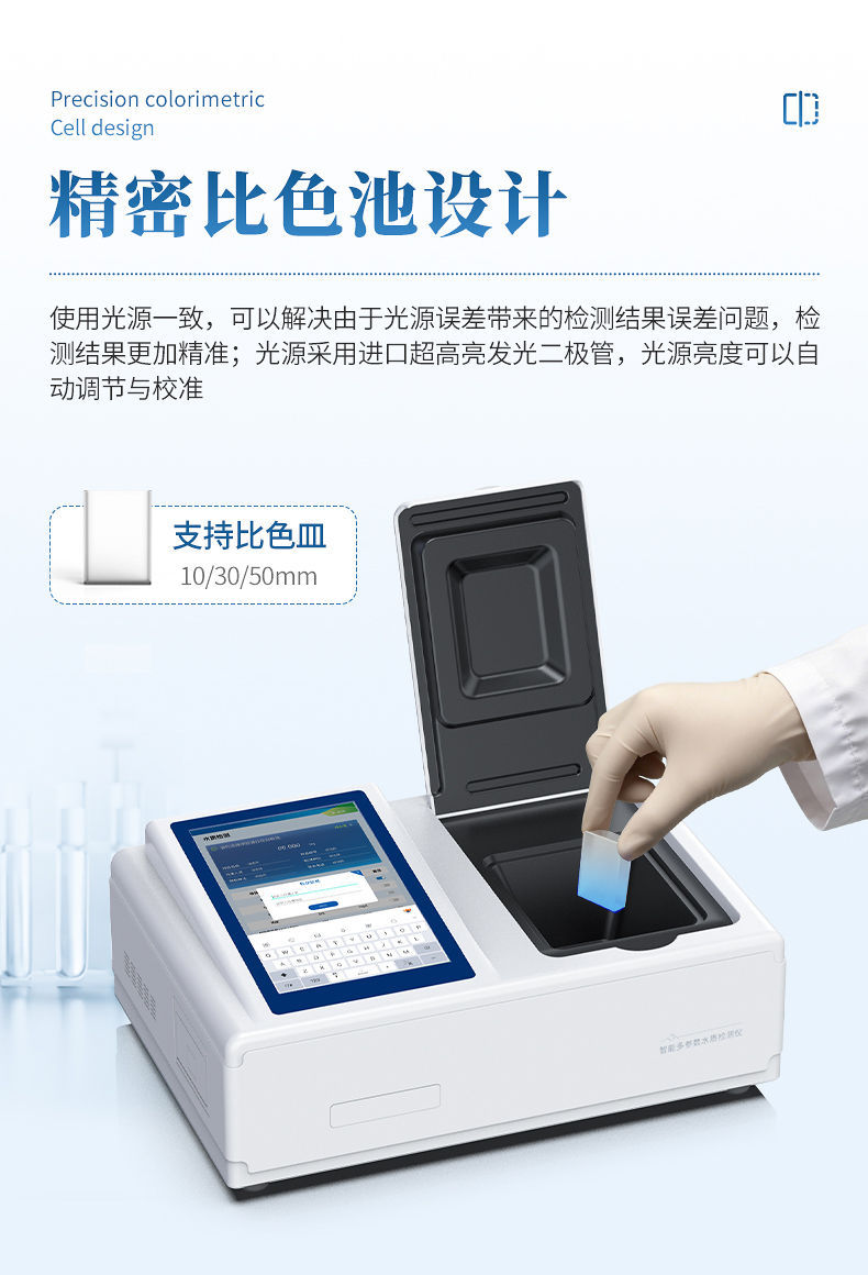 3、采用精密比色池设计,使用光源一致,可以解决由于光源误差带来的检测结果误差问题,检测结果更加精准。