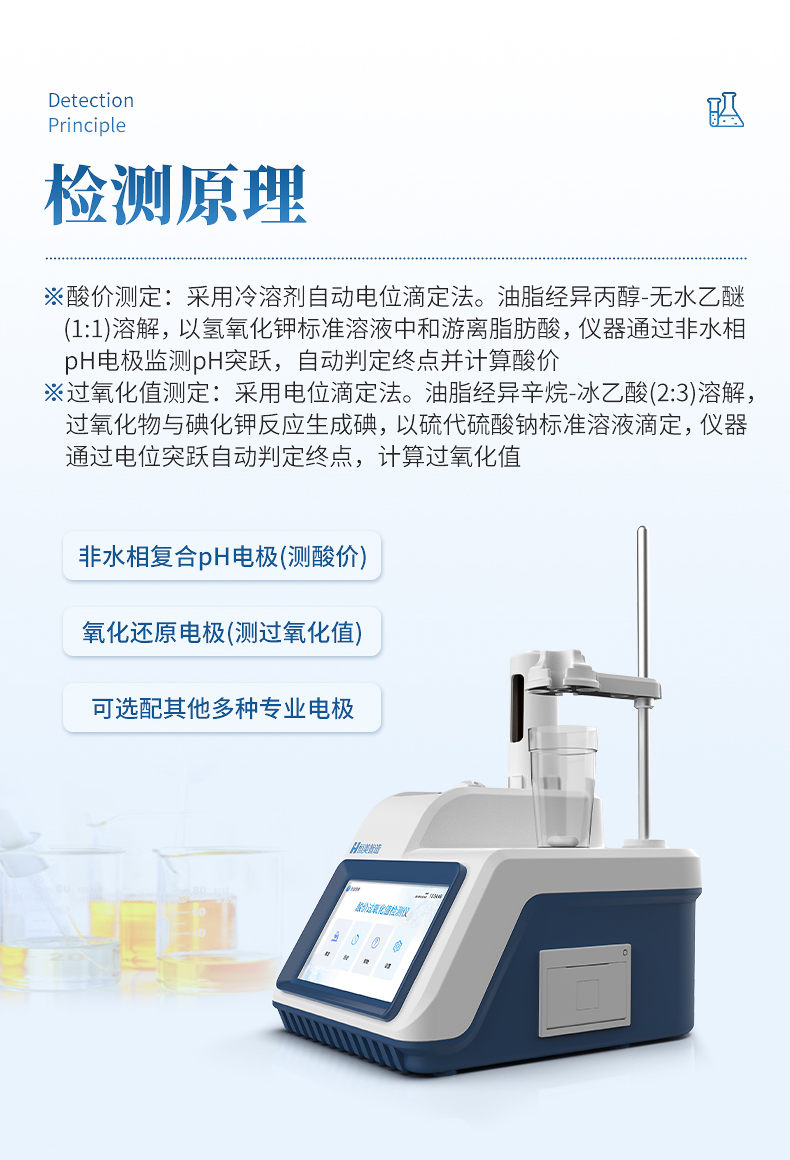 【产品简介】检测:酸价、过氧化值;标配非水相复合pH电极(测酸价)与氧化还原电极(测过氧化值)