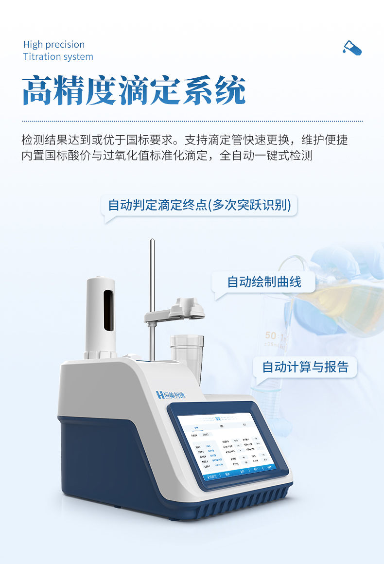 3.内置国标酸价与过氧化值标准化滴定,自动判定滴定终点(多次突跃识别)、自动绘制曲线、自动计算与报告的“全自动”一键式检测;