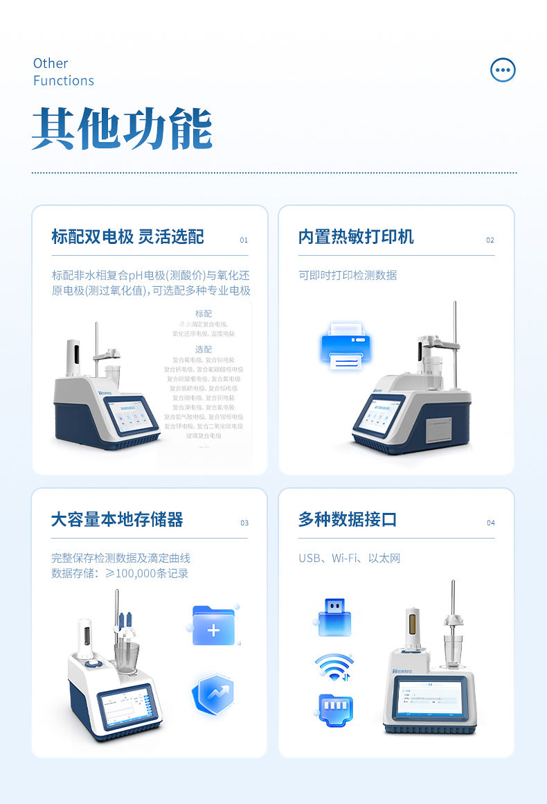 7.大容量本地存储器,完整保存检测数据及滴定曲线,内置热敏打印机可即时打印检测数据;