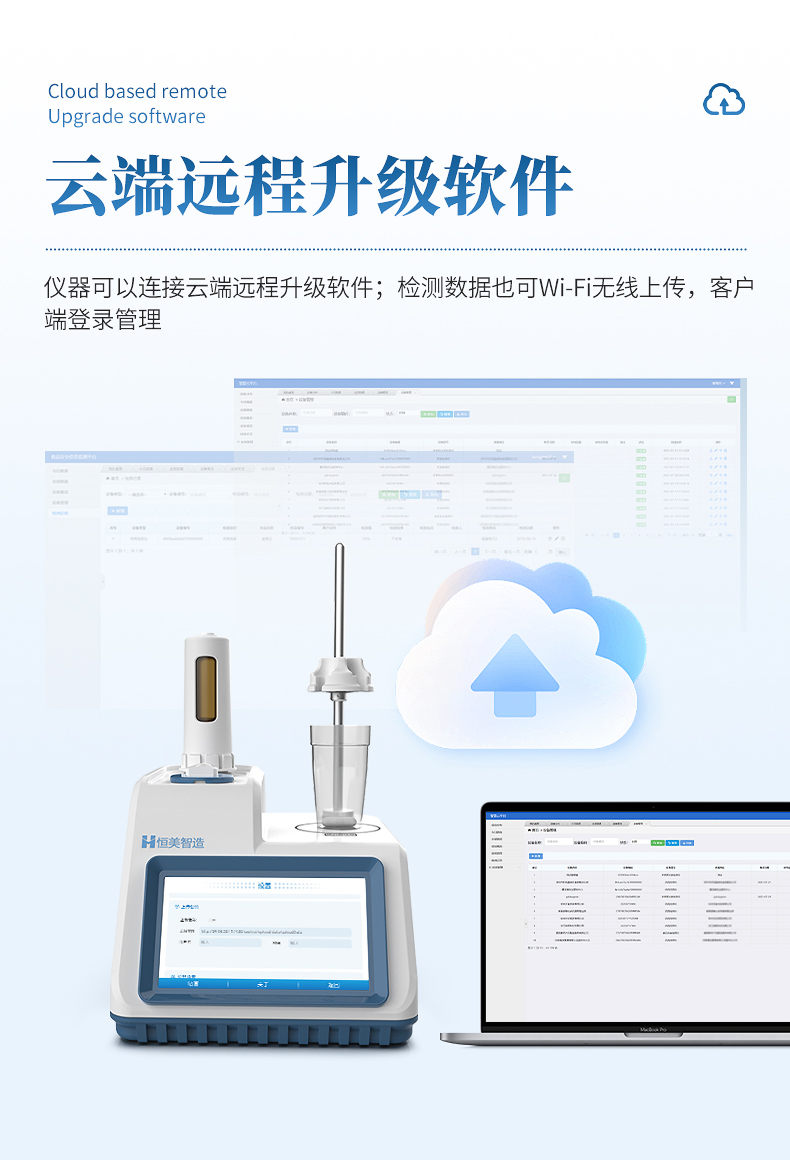 8.仪器可以连接云端远程升级软件;检测数据也可Wi-Fi无线上传,客户端登录管理。