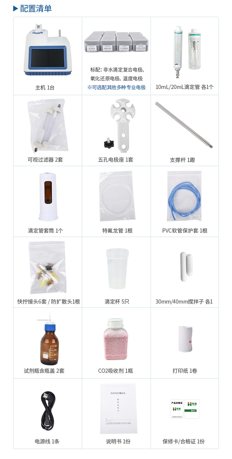 5.标配非水相复合pH电极(测酸价)与氧化还原电极(测过氧化值),也可选配多种专业电极满足不同检测需求;