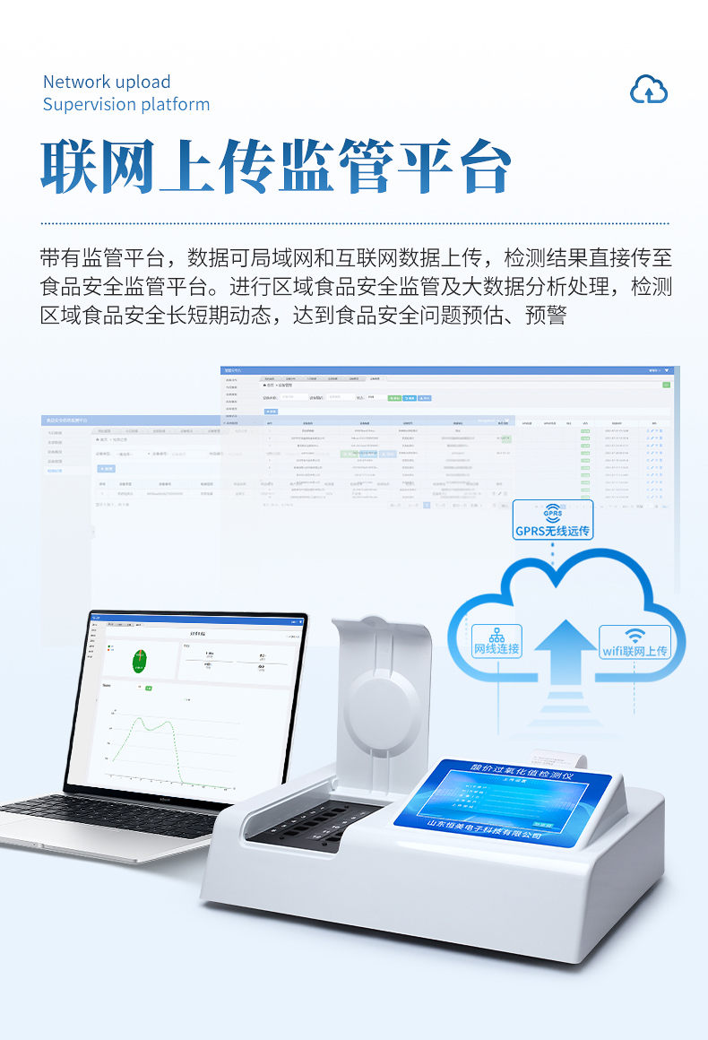 1、安卓智能操作系统,采用更加高效和人性化操作,仪器具有网线连接、wifi联网上传、GPRS无线远传功能,快速上传数据。