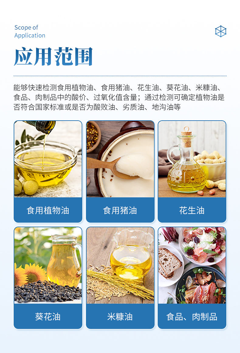 广泛应用于质量监督检验、工商管理、油炸食品生产基地、食药监局、卫生部门、肉制品食品深加工企业、商场超市、各大食品安全监测系统等单位使用。