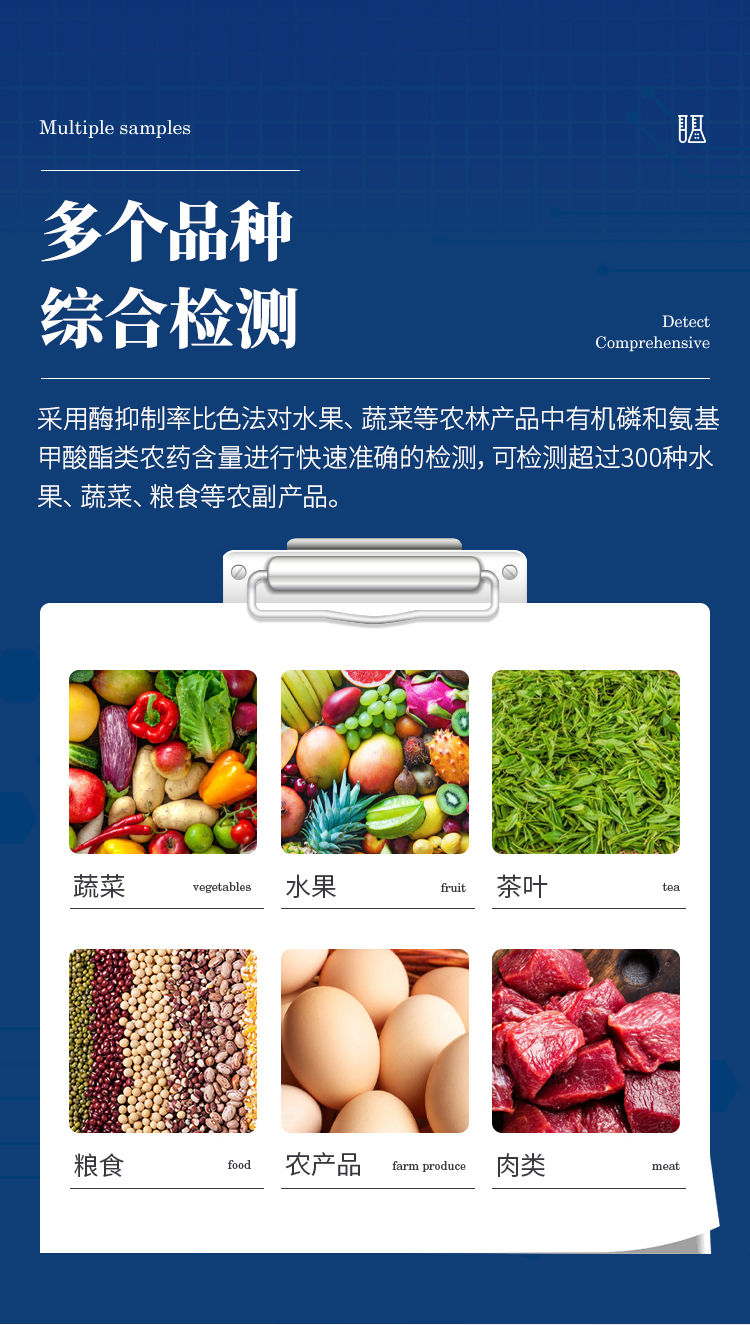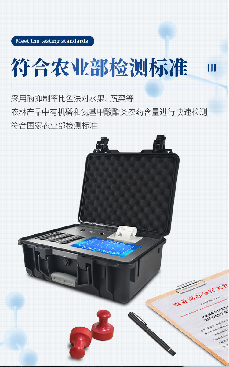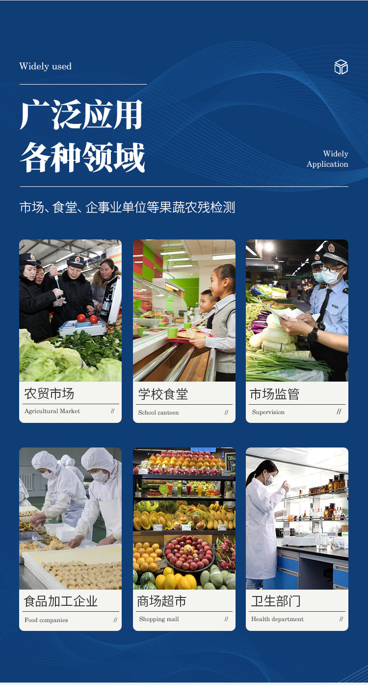 广泛应用于主要用于蔬菜、水果、茶叶、粮食、农副产品等食品中有机磷和氨基甲酸酯类农药残留的快速检测;此外还可用于果蔬茶生产基地和农贸批发销售市场现场检测,餐馆、学校、食堂、家庭果蔬加工前的安全速测等。