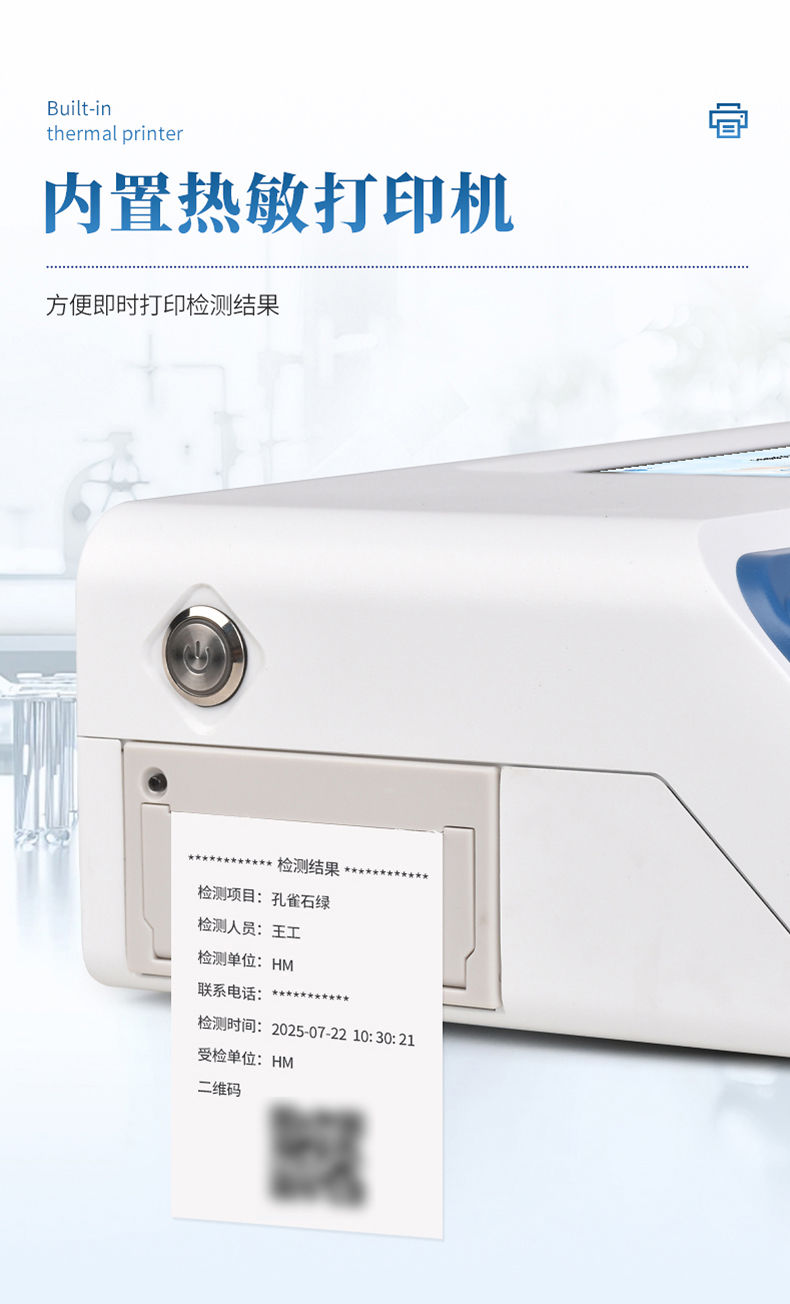 16、检测结果:报告出检测项目、被测物质的浓度、检测单位、被检查单位、检验员、检测时间、检测限等信息可在触摸屏上显示,可通过仪器内置打印机输出