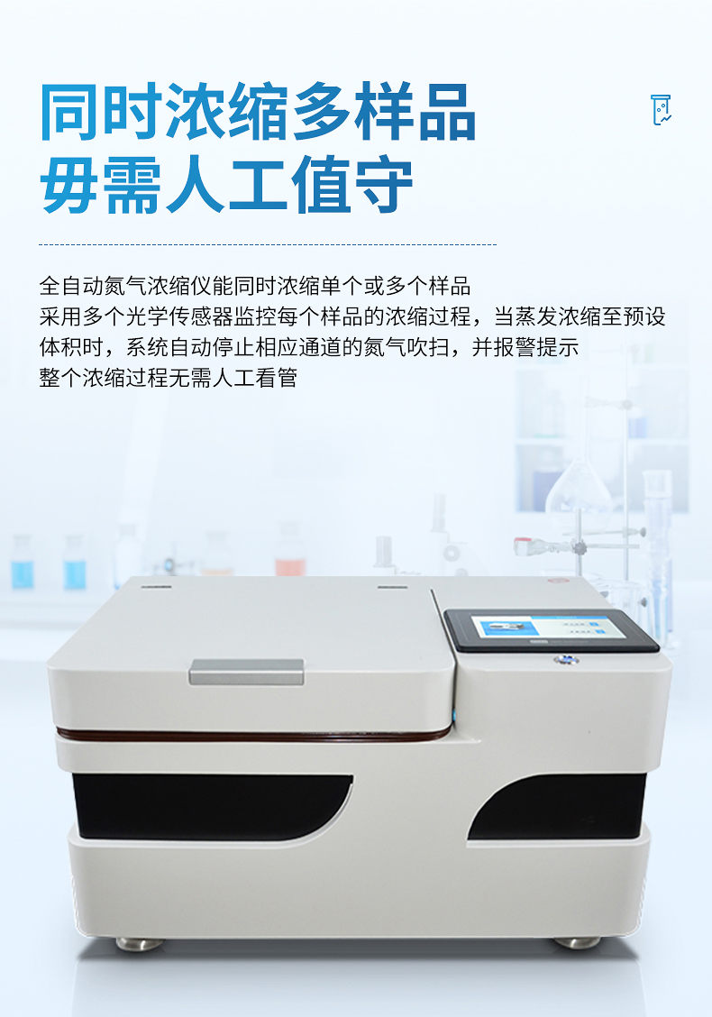 1、全自动氮气浓缩仪能同时浓缩单个或多个样品,毋需人工值守:全自动氮气浓缩仪采用多个光学传感器监控每个样品的浓缩过程,当蒸发浓缩至预设体积时,系统自动停止相应通道的氮气吹扫,并报警提示。整个浓缩过程无需人工看管;