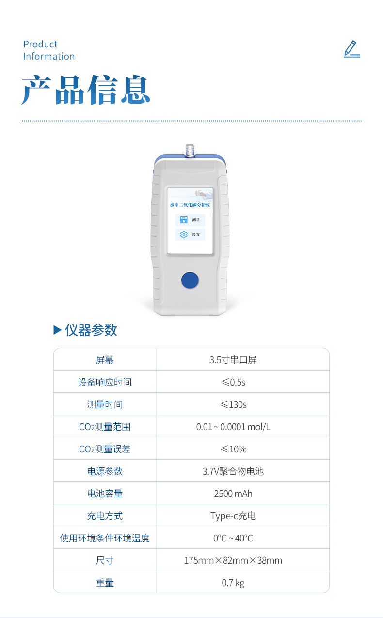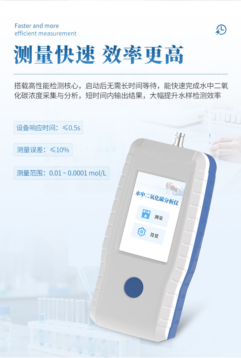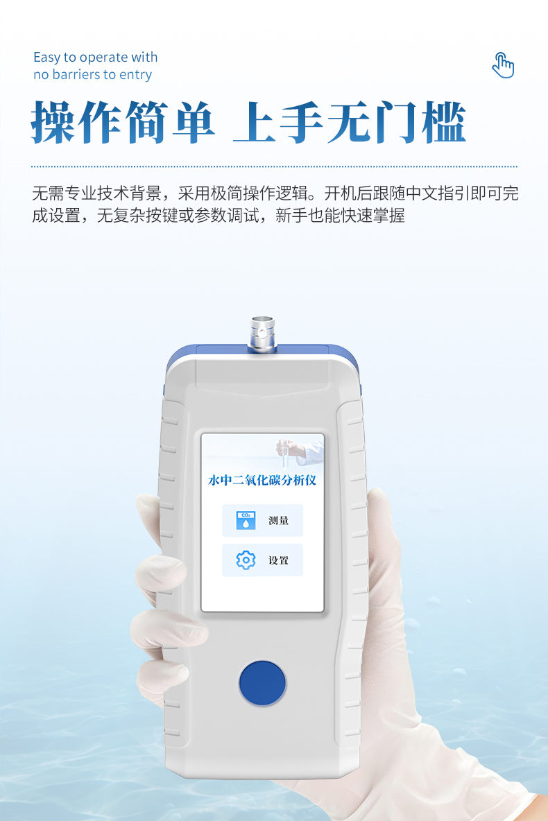 2、★测量快速,效率更高:搭载高性能检测核心,启动后无需长时间等待,能快速完成水中二氧化碳浓度采集与分析,短时间内即可输出结果,大幅提升水样检测效率,适配批量样本或紧急监测需求。