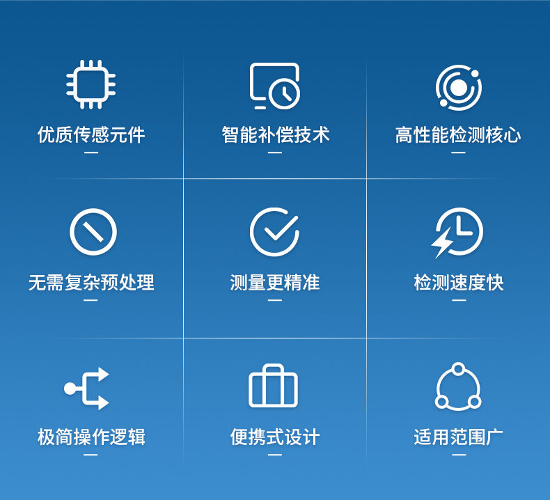 【产品简介】搭载高性能检测核心,机身采用轻量化材质打造,内置优质传感元件与智能补偿技术