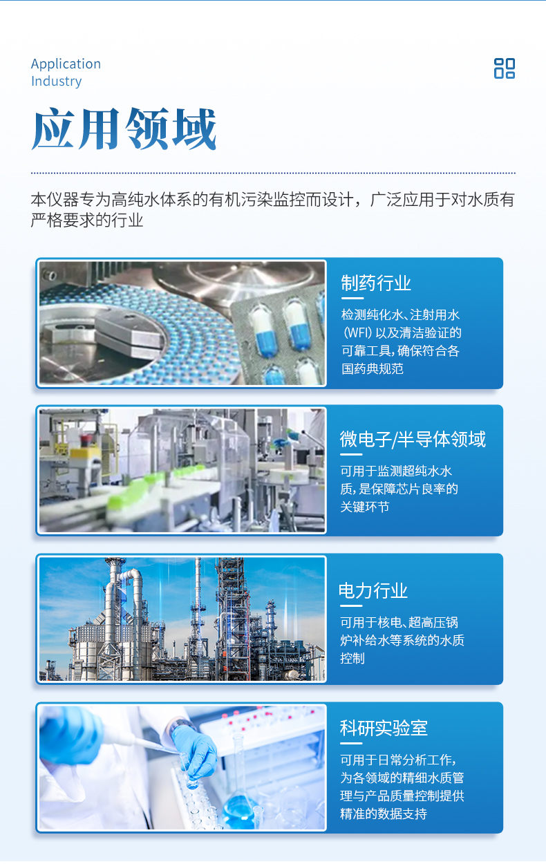 本仪器专为高纯水体系的有机污染监控而设计,广泛应用于对水质有严格要求的行业。它是制药行业检测纯化水、注射用水(WFI)以及清洁验证的可靠工具,确保符合各国药典规范。在微电子及半导体领域,可用于监测超纯水水质,是保障芯片良率的关键环节。同时,也适用于电力行业中的核电、超高压锅炉补给水等系统的水质控制,以及科研实验室的日常分析工作,为各领域的精细水质管理与产品质量控制提供精准的数据支持。