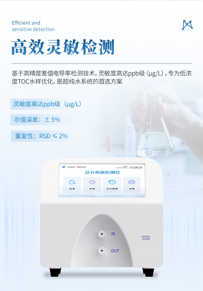 ★(2)高灵敏度检测:基于高精度差值电导率检测技术,灵敏度高达ppb级(μg/L),专为低浓度TOC水样优化,是超纯水系统的首选方案。