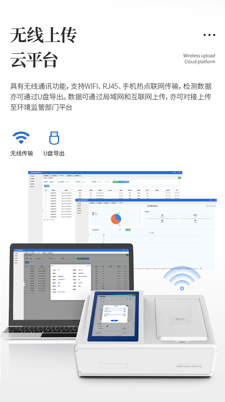 云平台:仪器带有监管平台,连接网络,检测结果直接传至环境安全监管平台;