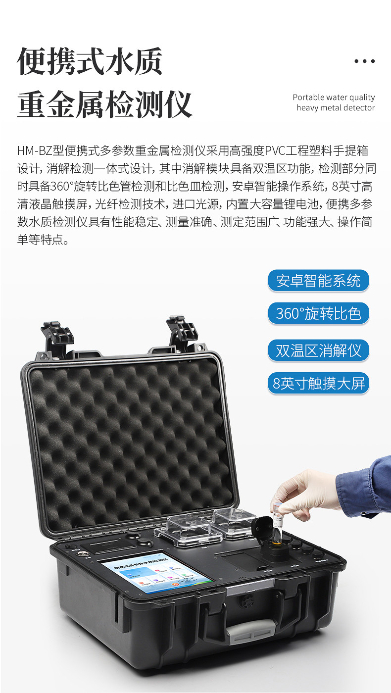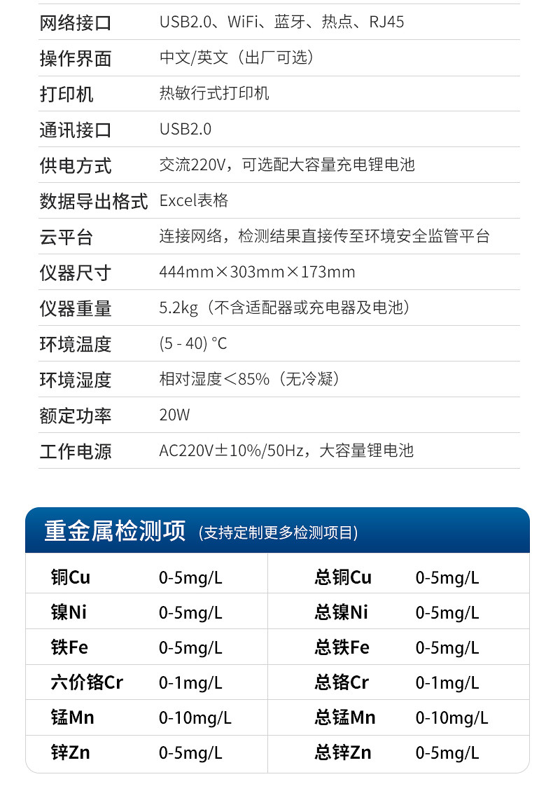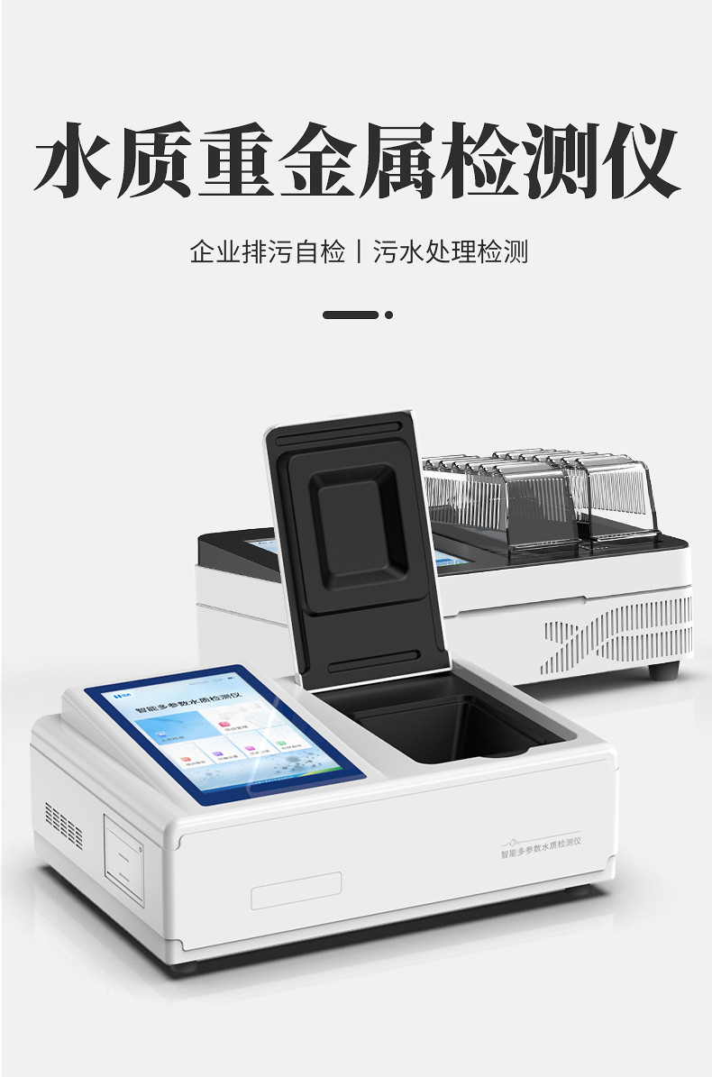 多参数水质重金属检测仪是完全参考国家标准、环境标准等相关标准设计制造,适用于国内外众多检测标准。 主要检测水质六价铬、总铬、铅、镉、汞、砷、铜、总铜、锌、总锌、铁、总铁、镍、总镍、锰、总锰、钛、钒、银、铝、锡、铍、钡、锑、钴等重金属含量指标;本仪器兼具智能数据分析功能,图表、列表显示数据,分析一目了然;高清晰度彩色液晶触摸显示屏,Android智能操作系统,中文显示界面,中英文键盘,人性化操作,使用更简单。