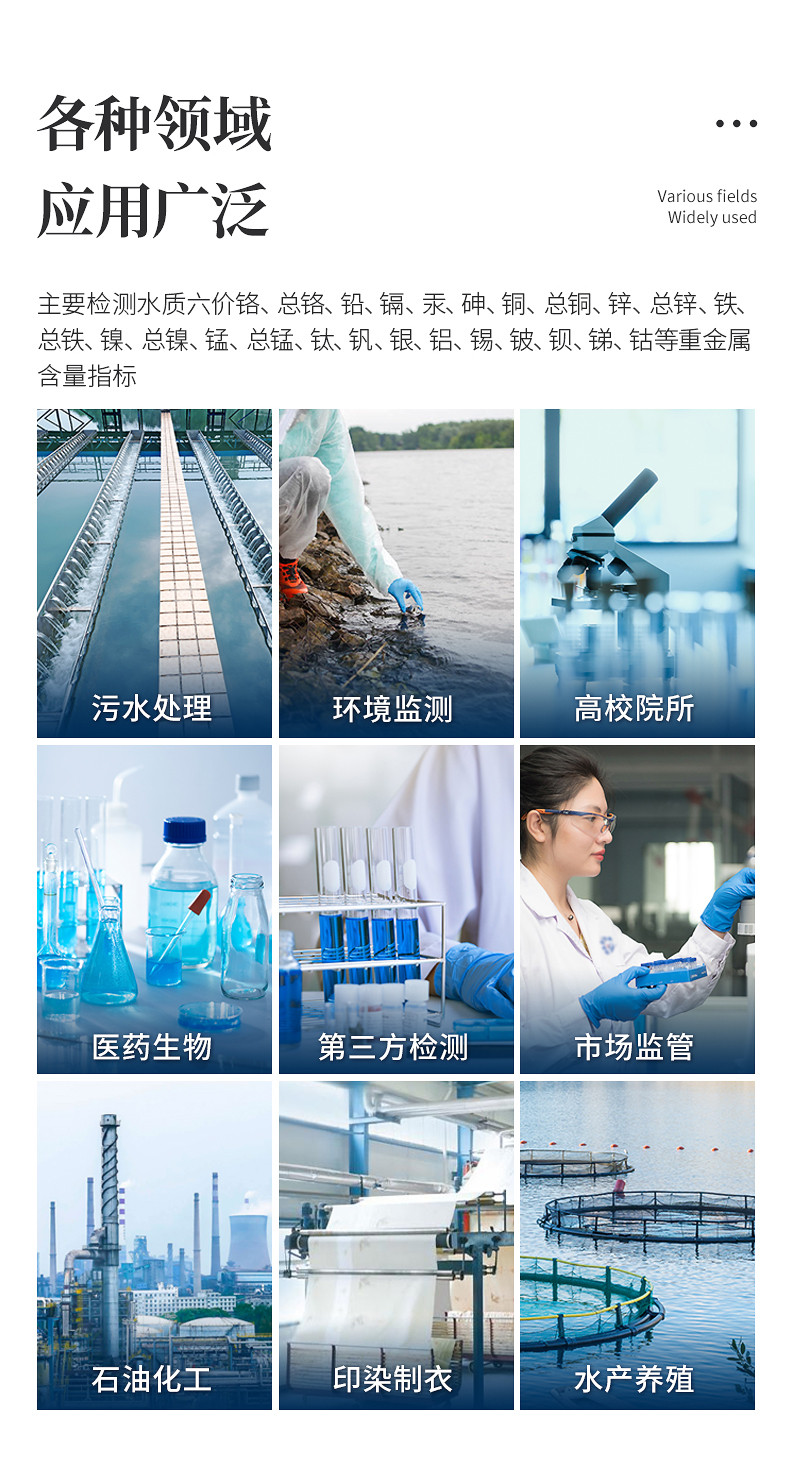 能够广泛的应用于各种行业(工业废水、城市污水、生活污水及江湖流域地表水)废水的检测,可适合不同用户的多种需求,可在化工、石油、焦化、造纸、冶金、酿造、医药等工业废水及各种生活污水监测应用。