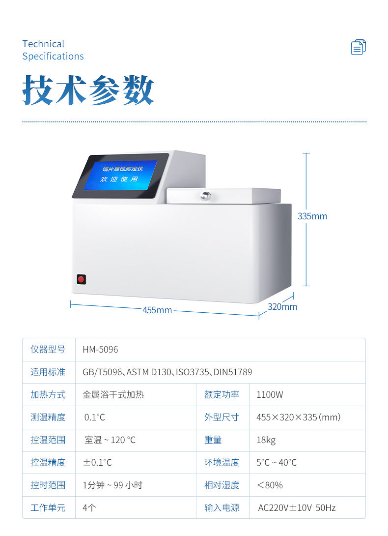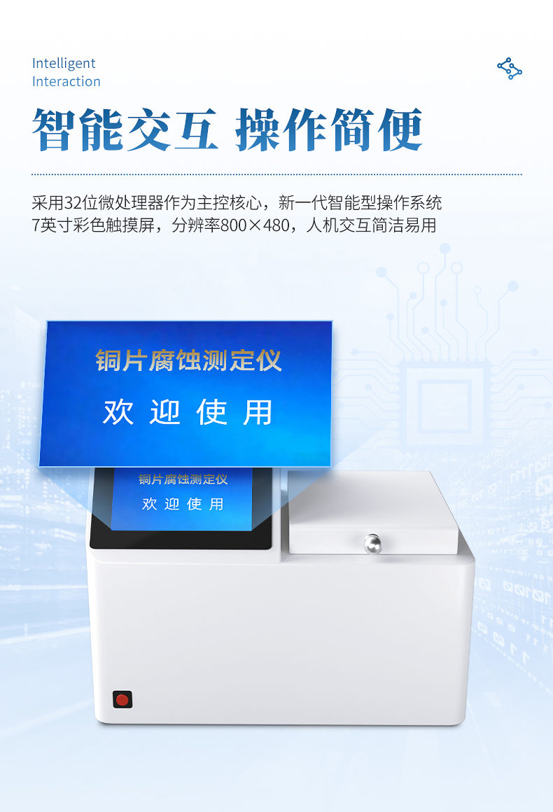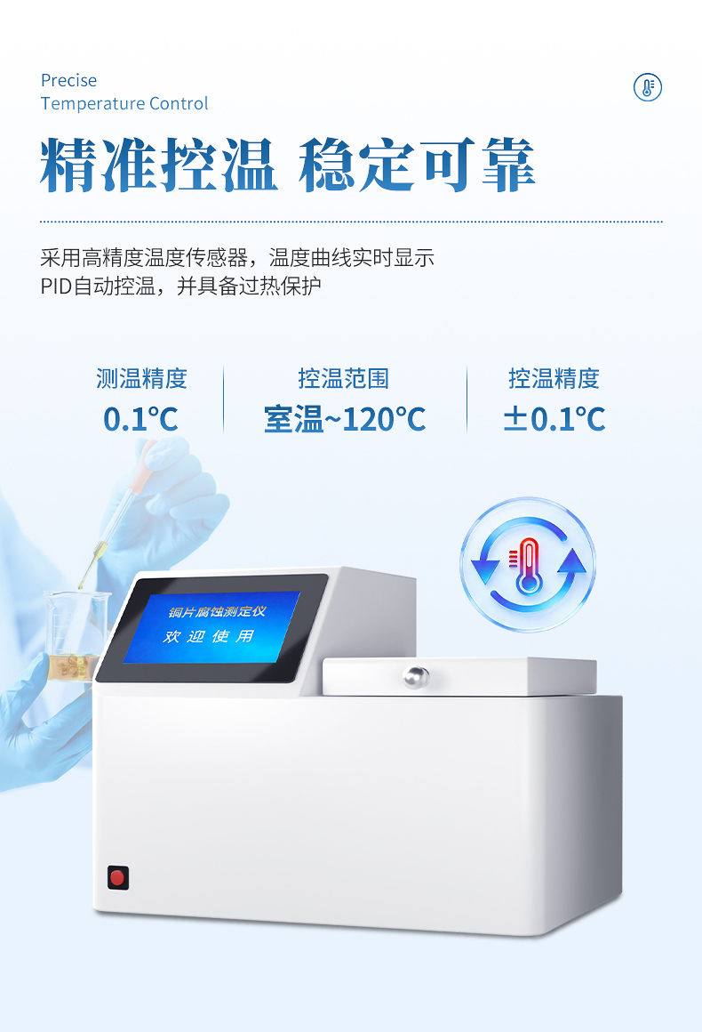 铜片腐蚀测定仪采用先进的32位MCU,7英寸大屏幕液晶显示,具有测温精度高、升温迅速、稳定可靠、操作简便、易于维护的优点。本机适用于变压器厂、供电部门、炼油厂、铁路、航运、贮油站及商业部门对石油产品腐蚀性质进行监测和控制,进行快速分析的必要仪器。测量结果符合GB/T5096方法规范。