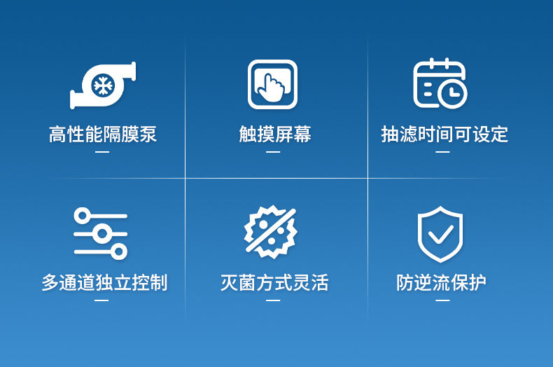 【产品简介】六联滤头,一次性过滤杯,抽滤泵内置,5寸液晶触摸显示控制