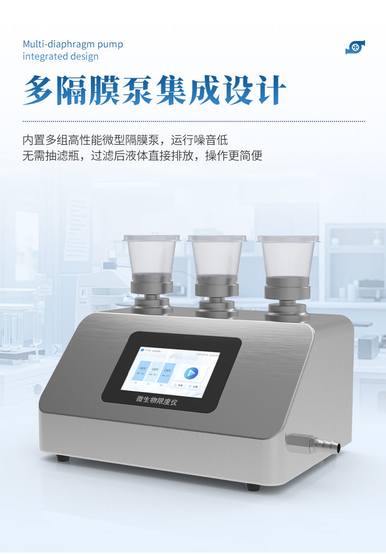 2. 多隔膜泵集成设计:内置多组高性能微型隔膜泵,运行噪音低,无需抽滤瓶,过滤后液体直接排放,操作更简便。