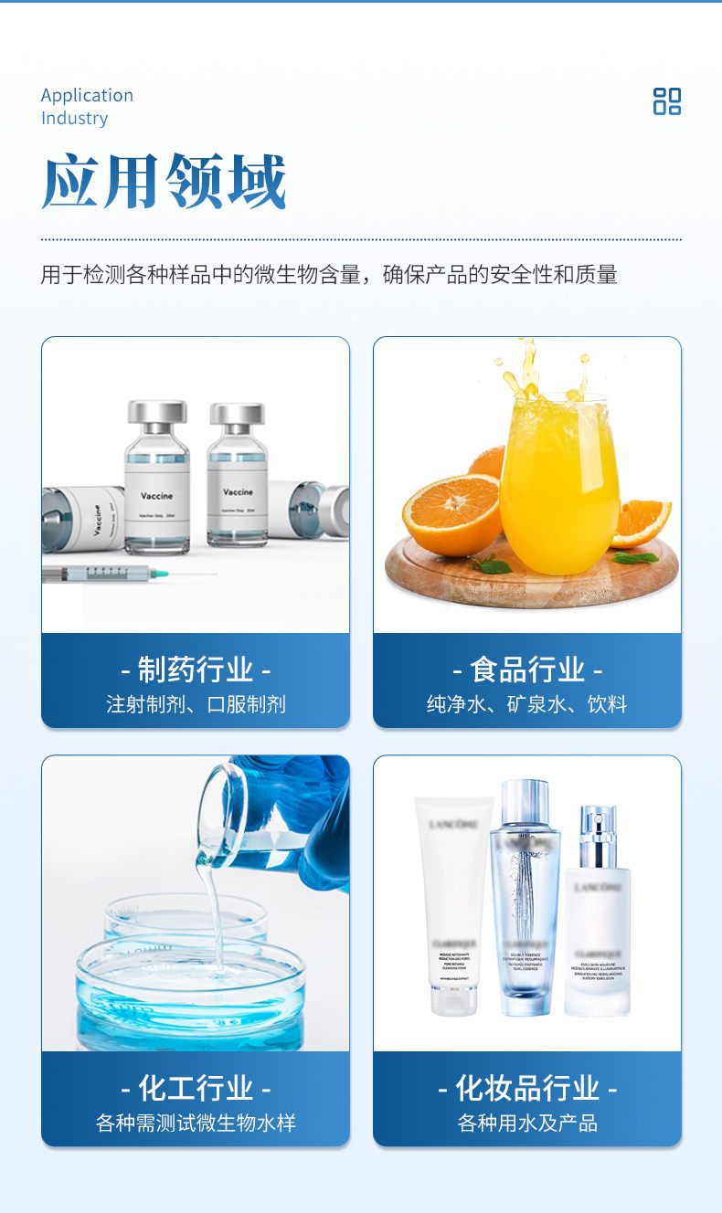 制药行业:适用于制药用水(纯化水、注射用水)、液体原料及非规定灭菌制剂药品的微生物限度检验。