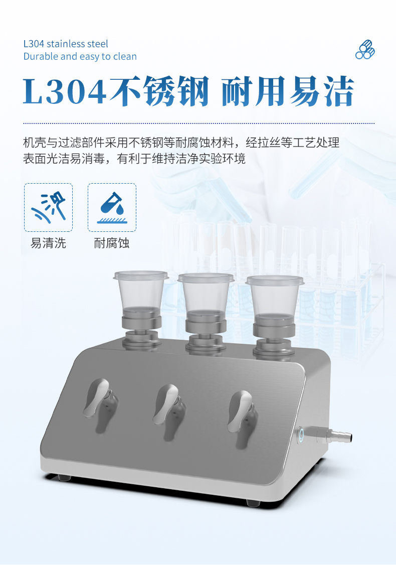 3. 灭菌方式灵活:过滤单元支持火焰快速灭菌及在线消毒;选用一次性滤杯时,泵头采用拔插式结构,便于拆装并适配多种灭菌方式。