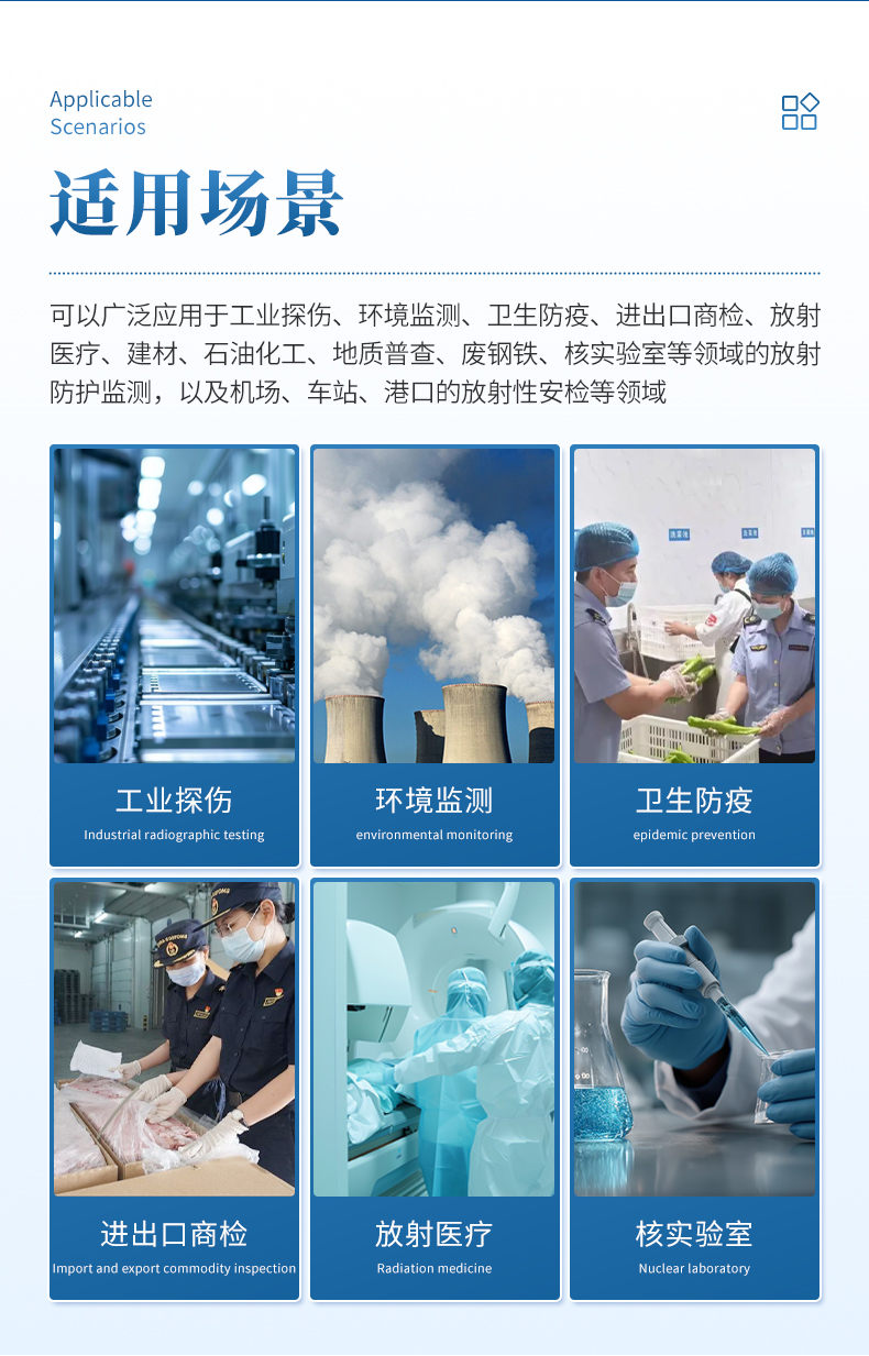 放射性检测仪是一款用于测量x,γ射线的便携式辐射检测仪器,它采用GM计数管作为探测器,反应速度快。可以广泛应用于工业探伤、环境监测、卫生防疫、进出口商检、放射医疗、建材、石油化工、地质普查、废钢铁、核实验室等领域的放射防护监测,以及机场、车站、港口的放射性安检等领域。