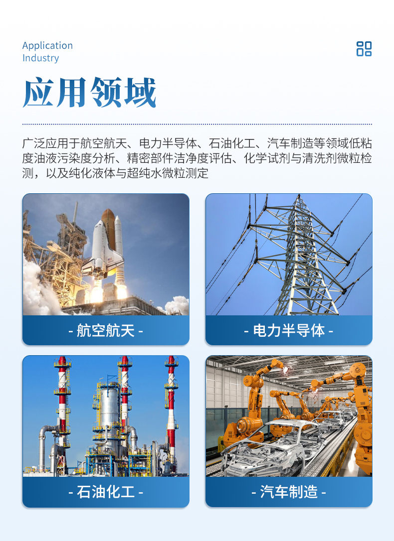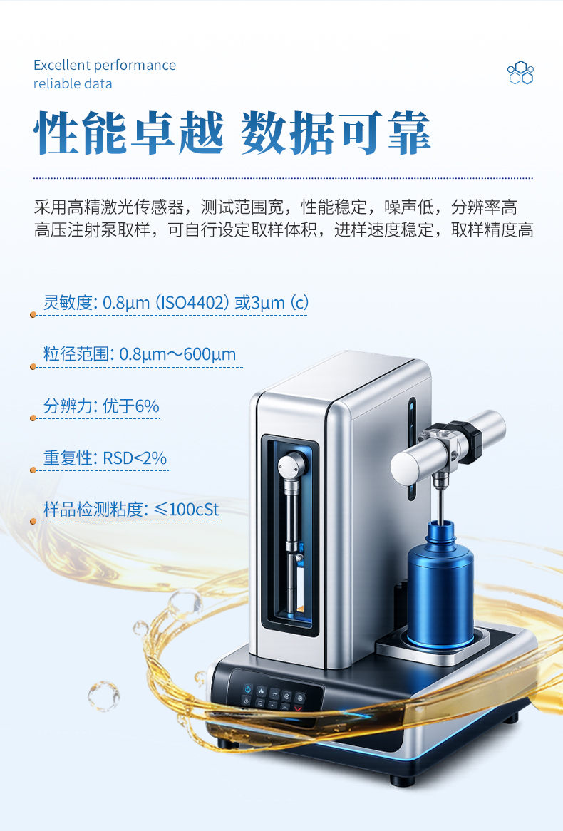水中颗粒计数器采用光阻(遮光)法计数原理研制。可提供快速、准确、可靠、可重复的检测结果,适用于多种低粘度液体中固体颗粒物尺寸和数量检测。广泛应用于航空航天、电力半导体、石油化工、汽车制造等领域低粘度油液污染度分析、精密部件洁净度评估、化学试剂与清洗剂微粒检测,以及纯化液体与超纯水微粒测定。