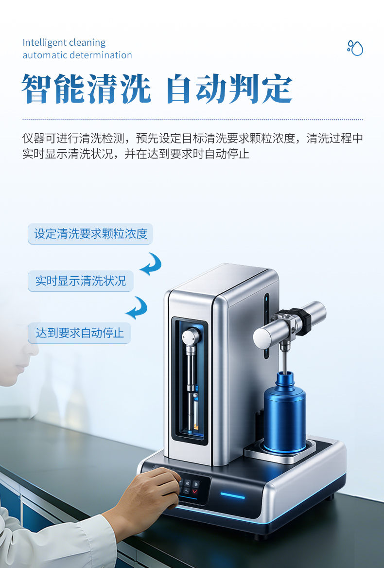 l 可进行清洗检测,预先设定目标清洗要求颗粒浓度,清洗过程中实时显示清洗状况,并在达到要求时自动停止