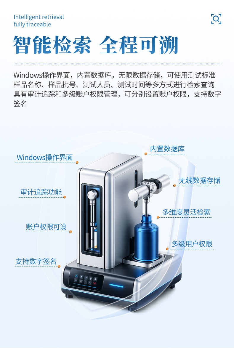 l Windows操作界面,内置数据库,无限数据存储,可使用测试标准、样品名称、样品批号、测试人员、测试时间等多种方式进行检索查询