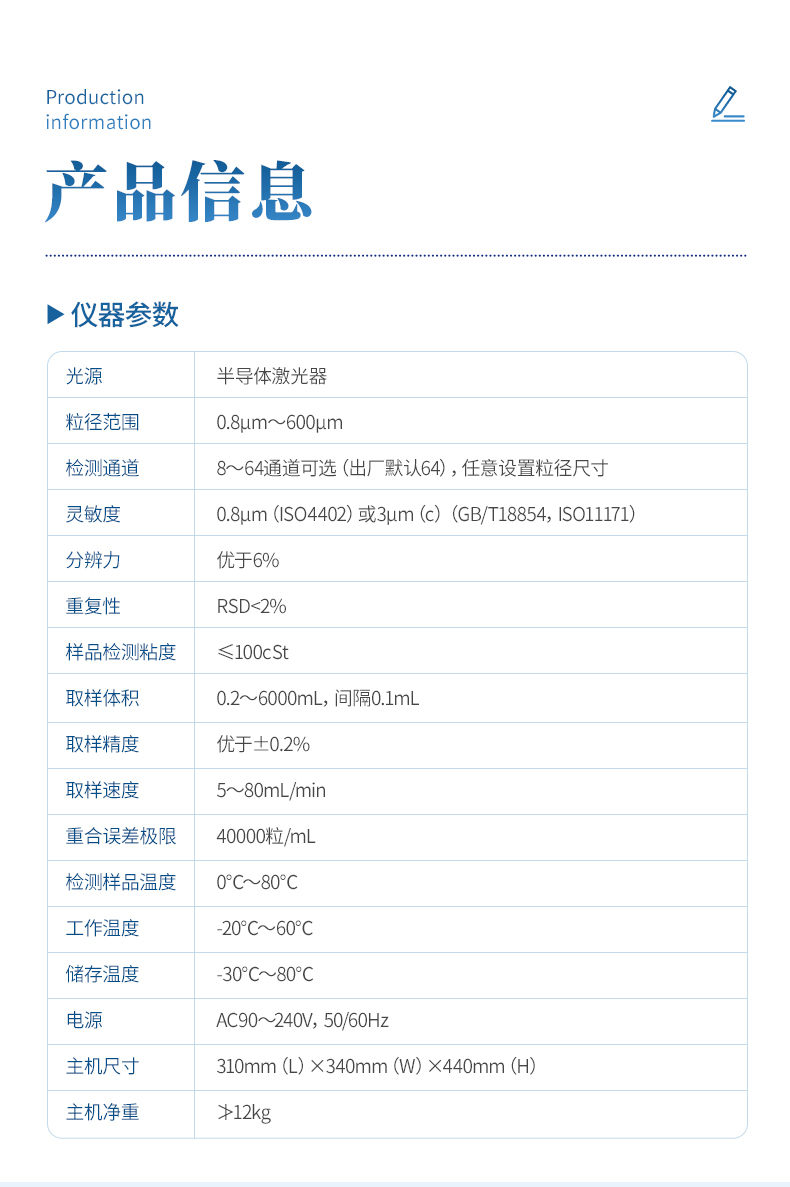 l 灵敏度:0.8μm(ISO4402)或3μm(c)(GB/T18854,ISO11171)