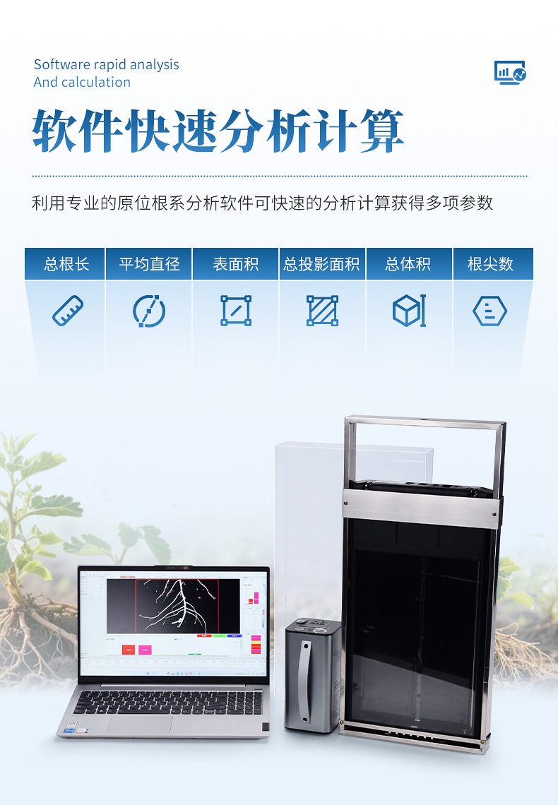利用专业的原位根系分析软件可快速的分析计算获得总根长、平均直径、表面积、总投影面积、总体积、根尖数等根系形态参数。