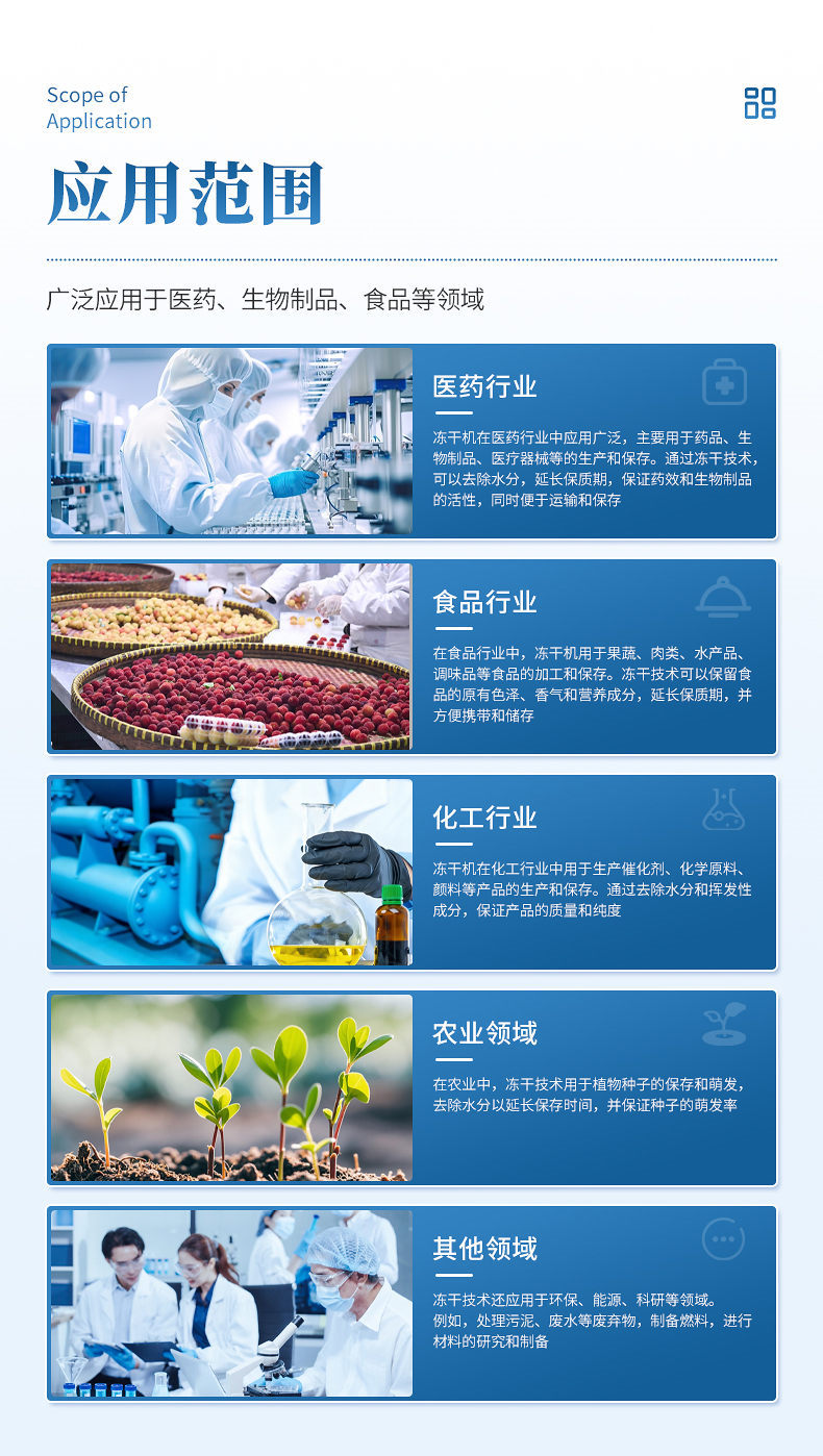 1. 医药行业:冻干机在医药行业中应用广泛,主要用于药品、生物制品、医疗器械等的生产和保存。通过冻干技术,可以去除水分,延长保质期,保证药效和生物制品的活性,同时便于运输和保存。