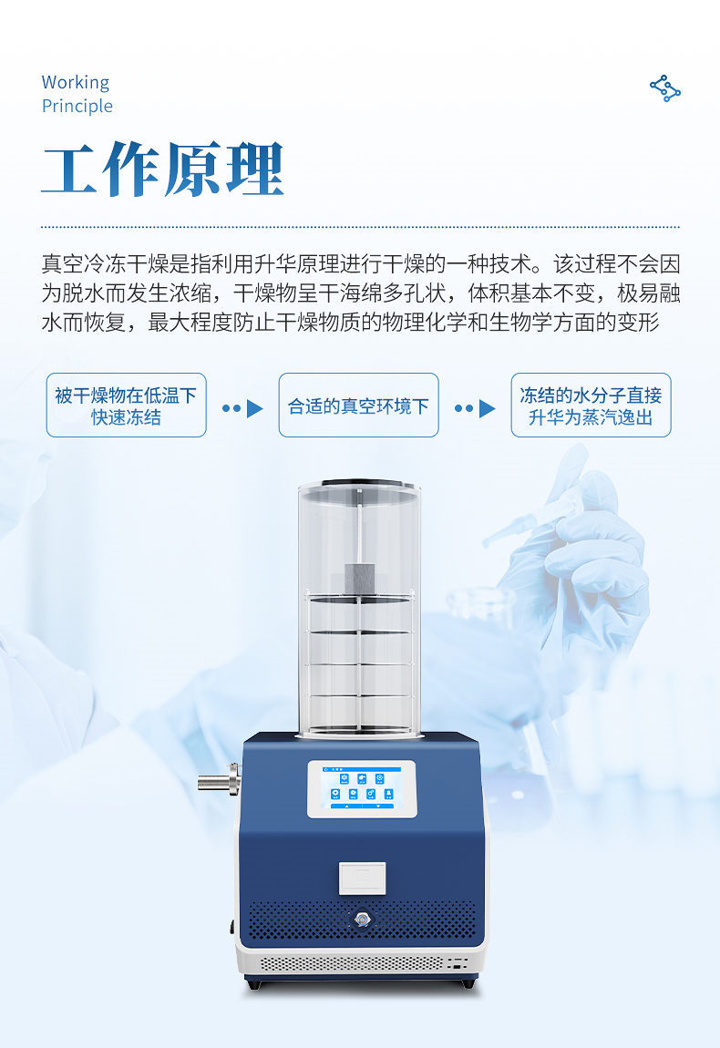 真空冷冻干燥是指利用升华原理进行干燥的一种技术,即被干燥物在低温下快速冻结,然后在合适的真空环境下,使冻结的水分子直接升华为蒸汽逸出。该过程不会因为脱水而发生浓缩,干燥物呈干海绵多孔状,体积基本不变,极易融水而恢复,最大程度防止干燥物质的物理化学和生物学方面的变形。