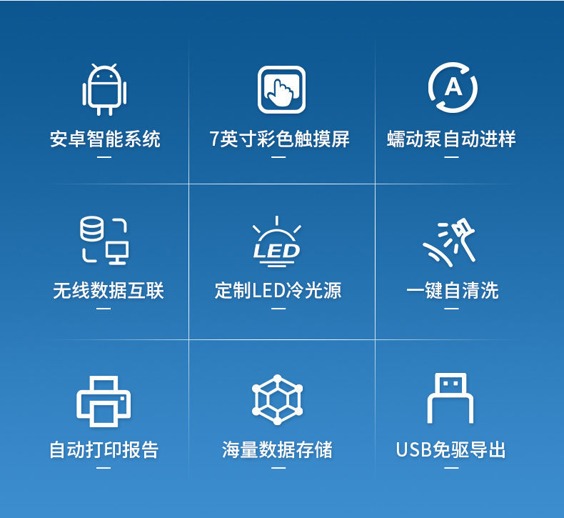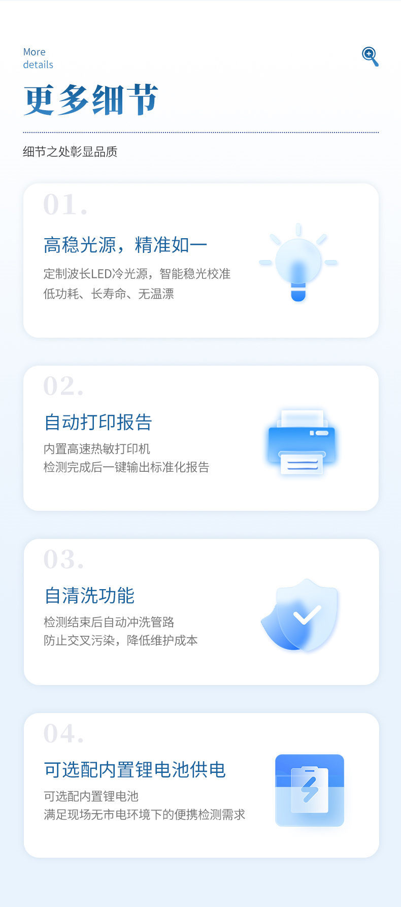 4、定制波长高稳定性LED冷光源,检测数据更稳定,功耗低,寿命长;